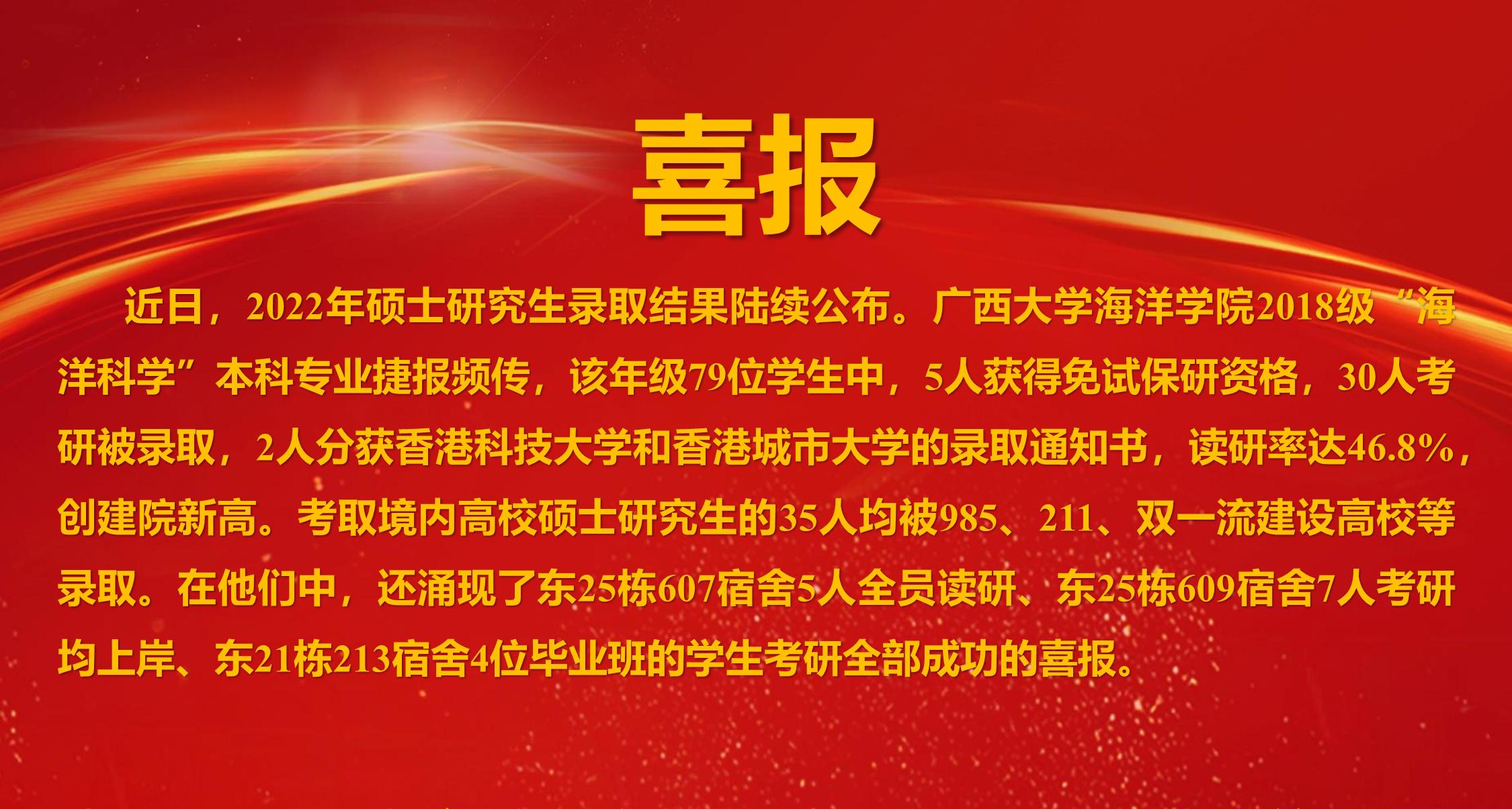 近日,2022年硕士研究生录取结果陆续公布。suncitygroup太阳新城2018级“海洋科学”本科专业捷报频传,该年级79位员工中,5人获得免试保研资格,30人考研被录取,2人分获香港科技大学和香港城市大学的录取通知书,读研率达46.8%,创建院新高。考取境内高校硕士研究生的35人均被985、211、双一流建设高校等录取。在他们中,还涌现了东25栋607宿舍5人全员读研、东25栋609宿舍7人考研均上岸、东21栋213宿舍4位毕业班的员工考研全部成功的喜报。