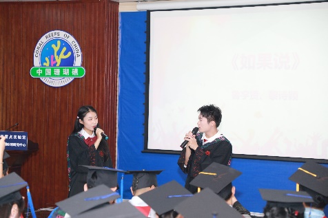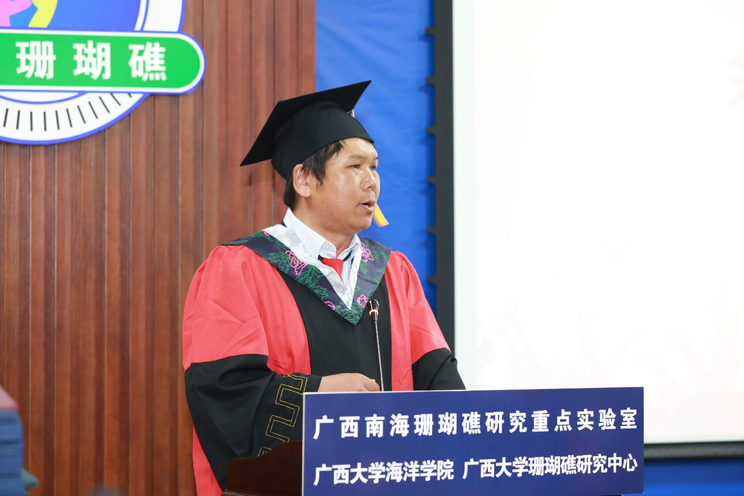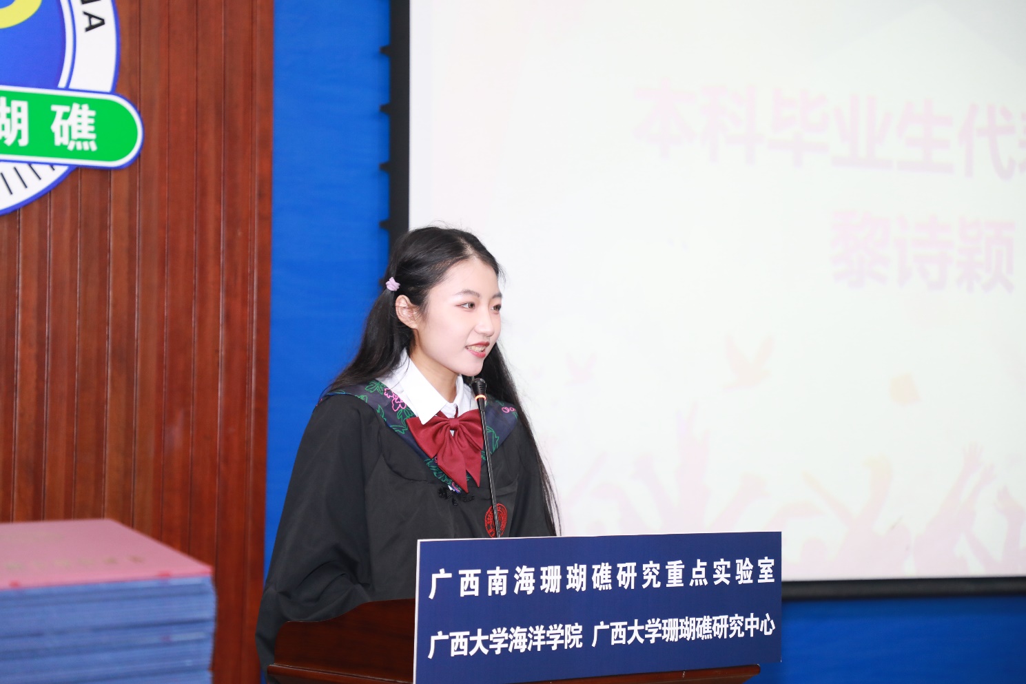 海洋科学2022级本科生毕业生代表、2023届suncitygroup太阳新城优秀毕业生获得者黎诗颖对公司提供优秀的学习环境和成长平台表示感谢,回顾了大学四年在专业知识、组织协调能力、团队协作能力和沟通表达能力等的成长和收获,对辛勤耕耘的老师、家人、朋友、同学表示感谢,对未来继续实现自己的梦想而努力奋斗。海洋科学2023届硕士毕业生代表梁日升作为suncitygroup太阳新城建设的见证人,讲述了2016年本科入学以来他眼中的公司、在公司的成长之路,他以导师余克服教授赠予的“科学研究必须要脚踏实地,欲速不达”与同学们共勉,并分享了在求学、科研路上的点滴感悟,以此相互激励。教师代表、海洋科学2019级2班班主任苏宏飞老师以他颇具特色的口音向同学们致以衷心的祝福,并对同学们提出了几点建议与期待:勇于改变,主动明确目标向好前进;甘于奉献,勇于牺牲小我成就大家;守于心田,坚守不忘初心无愧时代。
