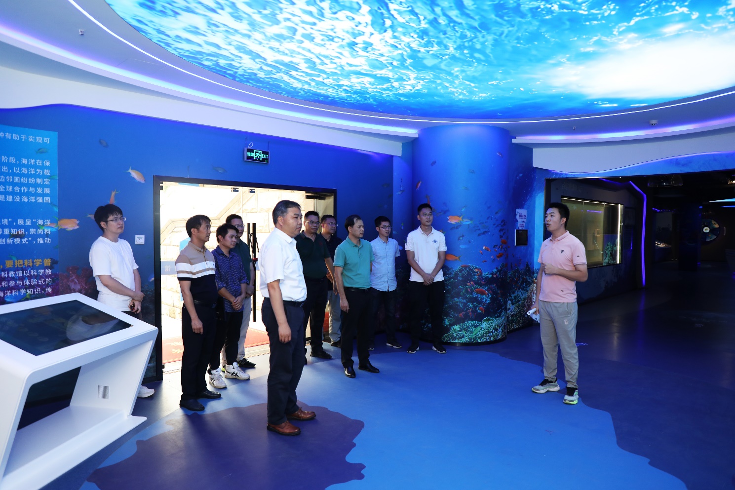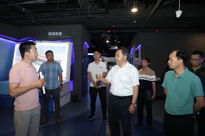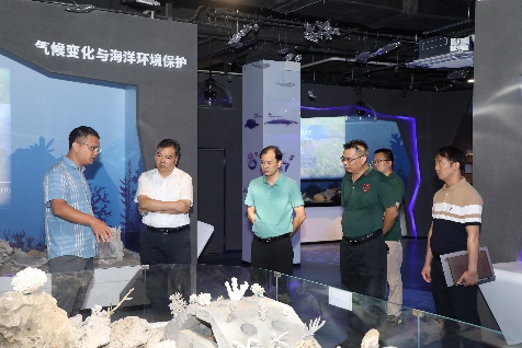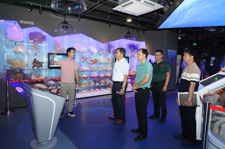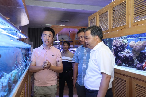 肖建庄先后考察了海洋科教馆、公司样品库、广西南海珊瑚礁研究重点实验室、研究生学习室。公司俞小鹏、黄雯、王瑞等老师逐一介绍了科教馆的综合情况、公司教学科研及科普工作开展情况,并详细讲解了公司师生立足北部湾、面向南海,紧紧抓住珊瑚礁研究为学科特色,在多层次人才培养、多维度科学研究、多学科交叉融合等方面开展了积极有效的工作。