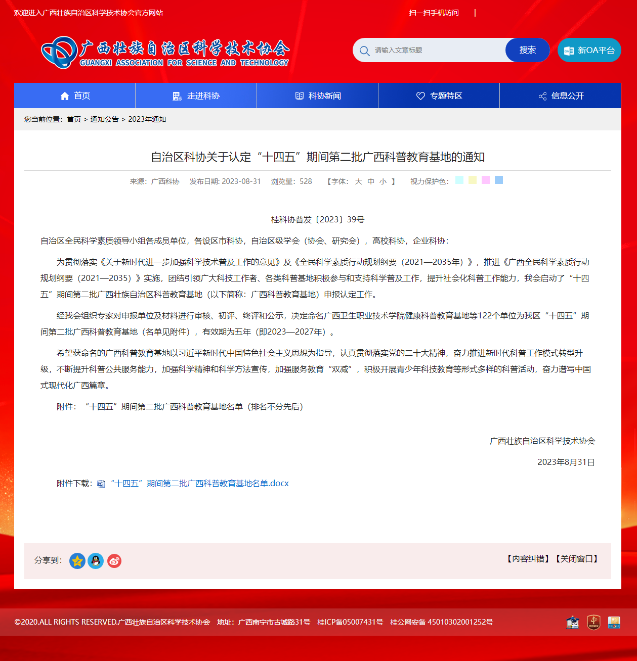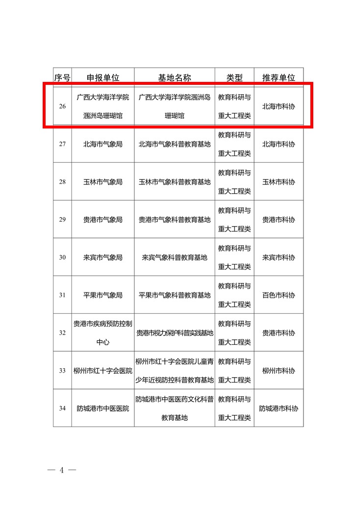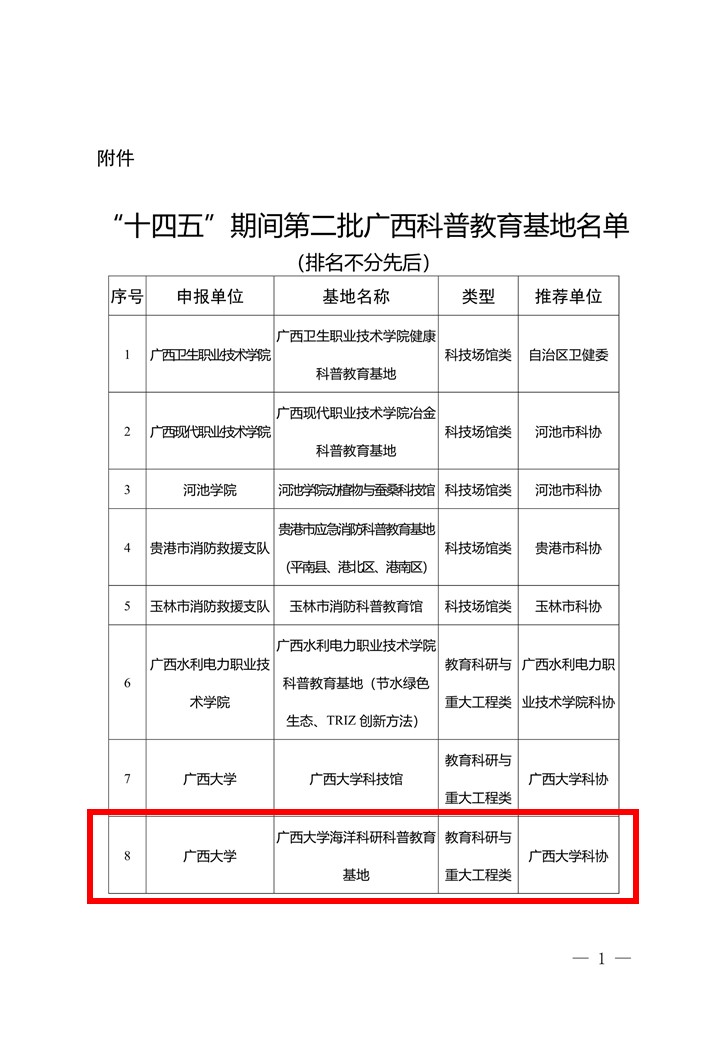 近日,自治区科学技术协会下发了《关于认定“十四五”期间第二批广西科普教育基地的通知》,公司“suncitygroup太阳新城海洋科研科普教育基地”、“suncitygroup太阳新城涠洲岛珊瑚馆”等2个基地分别入选(期限为2023—2027年)。