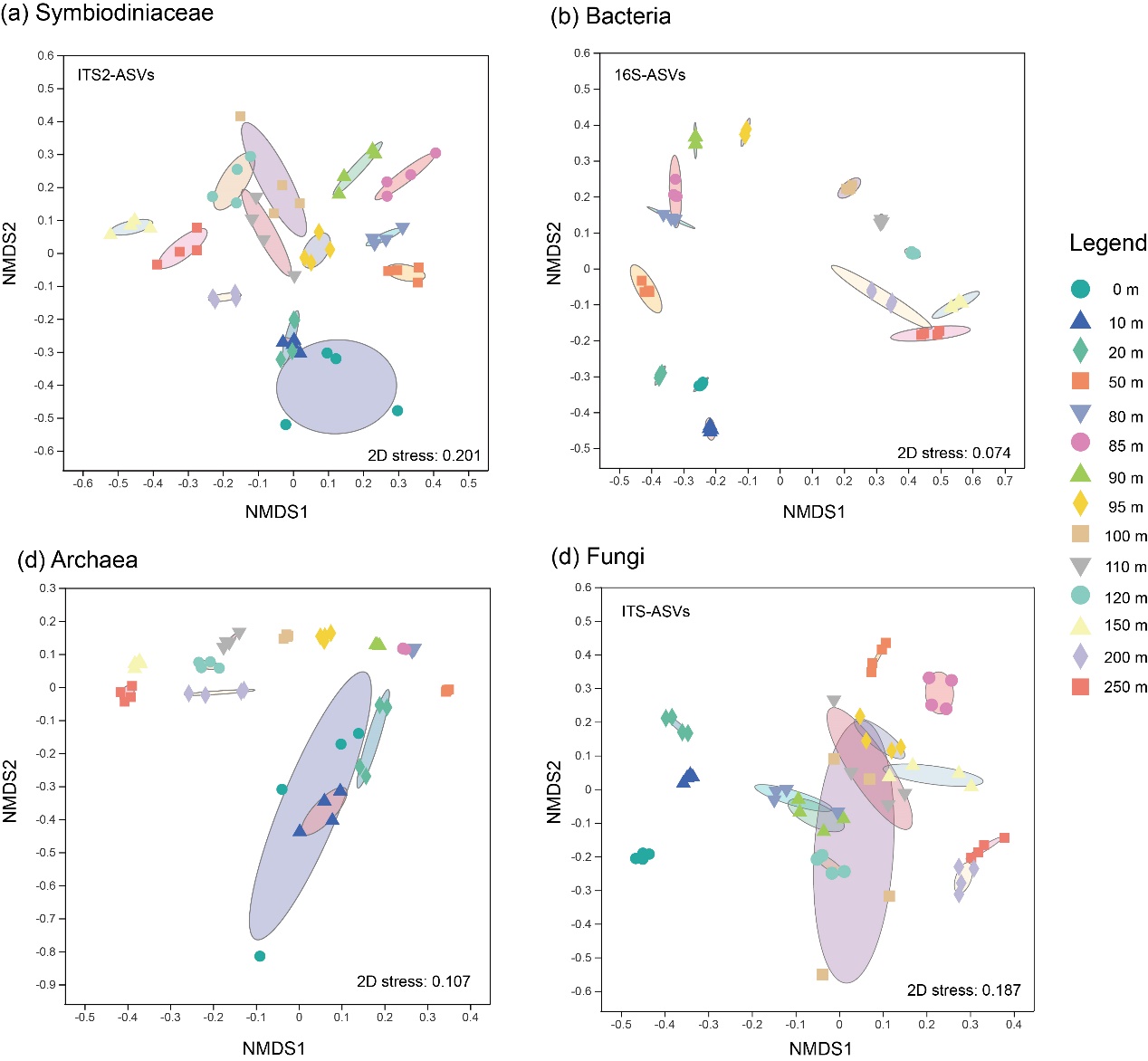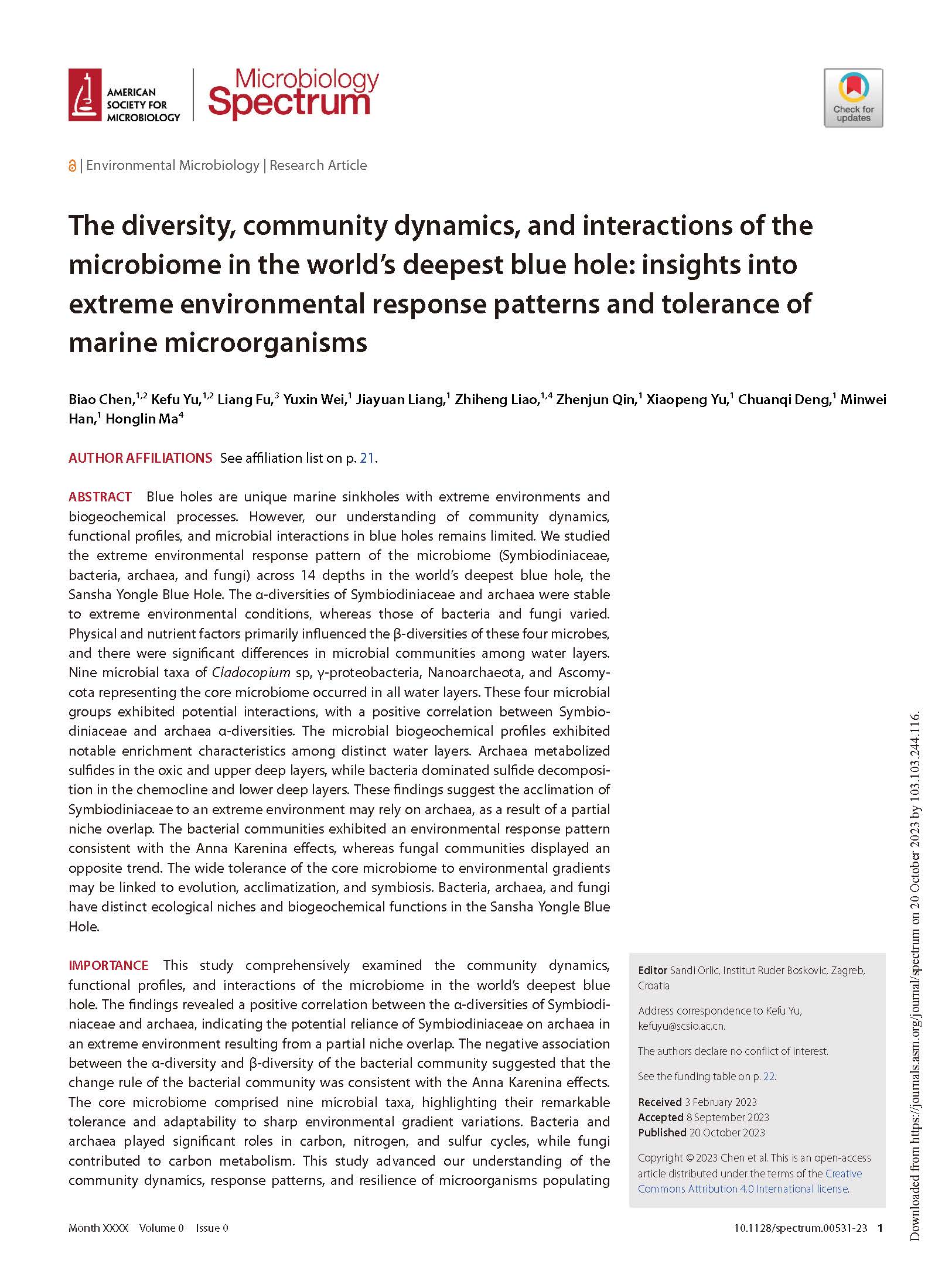 近日,公司海洋生物与生态教研室陈飚博士等在中国科公司一区Top期刊Microbiology Spectrum发表了题为“The diversity, community dynamics, and interactions of the microbiome in the world’s deepest blue hole: insights into extreme environmental response patterns and tolerance of marine microorganisms”的研究论文。该研究基于微生物组学技术,对西沙群岛珊瑚礁区的世界最深蓝洞—三沙永乐龙洞(300.89m)14个深度剖面的水体微生物进行了研究,解析微生物主要功能类群(虫黄藻、细菌、真菌以及古菌)在不同深度极端环境下的多样性变化、生态特征及其生物地球化学循环功能差异。