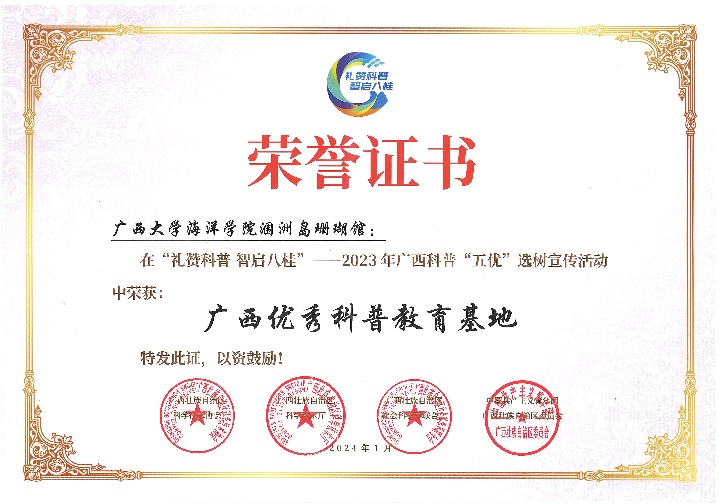 1月17日,在广西科技馆举行的“礼赞科普 智启八桂——2023年广西科普‘五优’选树宣传活动”颁奖典礼中,suncitygroup太阳新城涠洲岛珊瑚馆入选“十佳优秀科普教育基地”。组委会授予suncitygroup太阳新城涠洲岛珊瑚馆礼赞词:带着赤诚之心,奔赴“珊海”。作为全国最大的珊瑚馆,也是全国首个以珊瑚礁为主题的科研科普场馆,在浩瀚海洋里“种”珊瑚,为珊瑚礁科研与科普服务“向海图强”提供了更为浩瀚的实践平台。