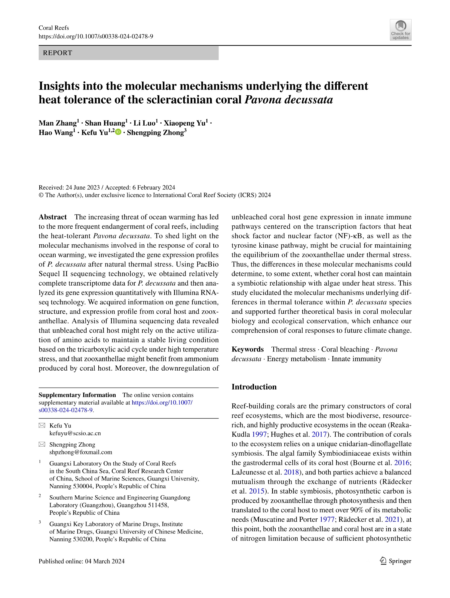 Zhang Man, Huang Shan, Luo Li, Yu Xiaopeng, Wang Hao, Yu Kefu, Zhong Shengping. (2024). Insights into the molecular mechanisms underlying the different heat tolerance of the scleractinian coral Pavona decussata. Coral Reefs. doi:10.1007/s00338-024-02478-9