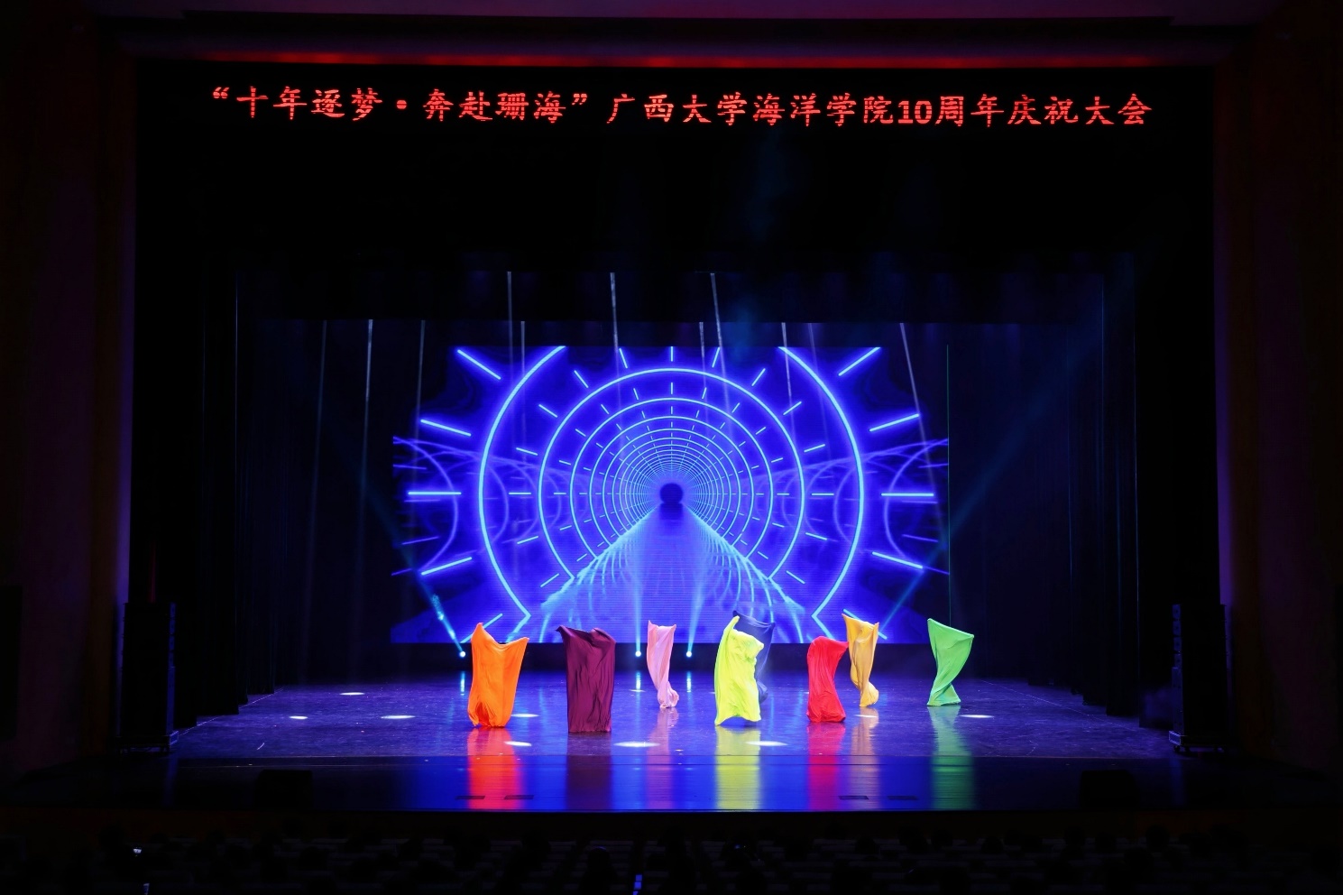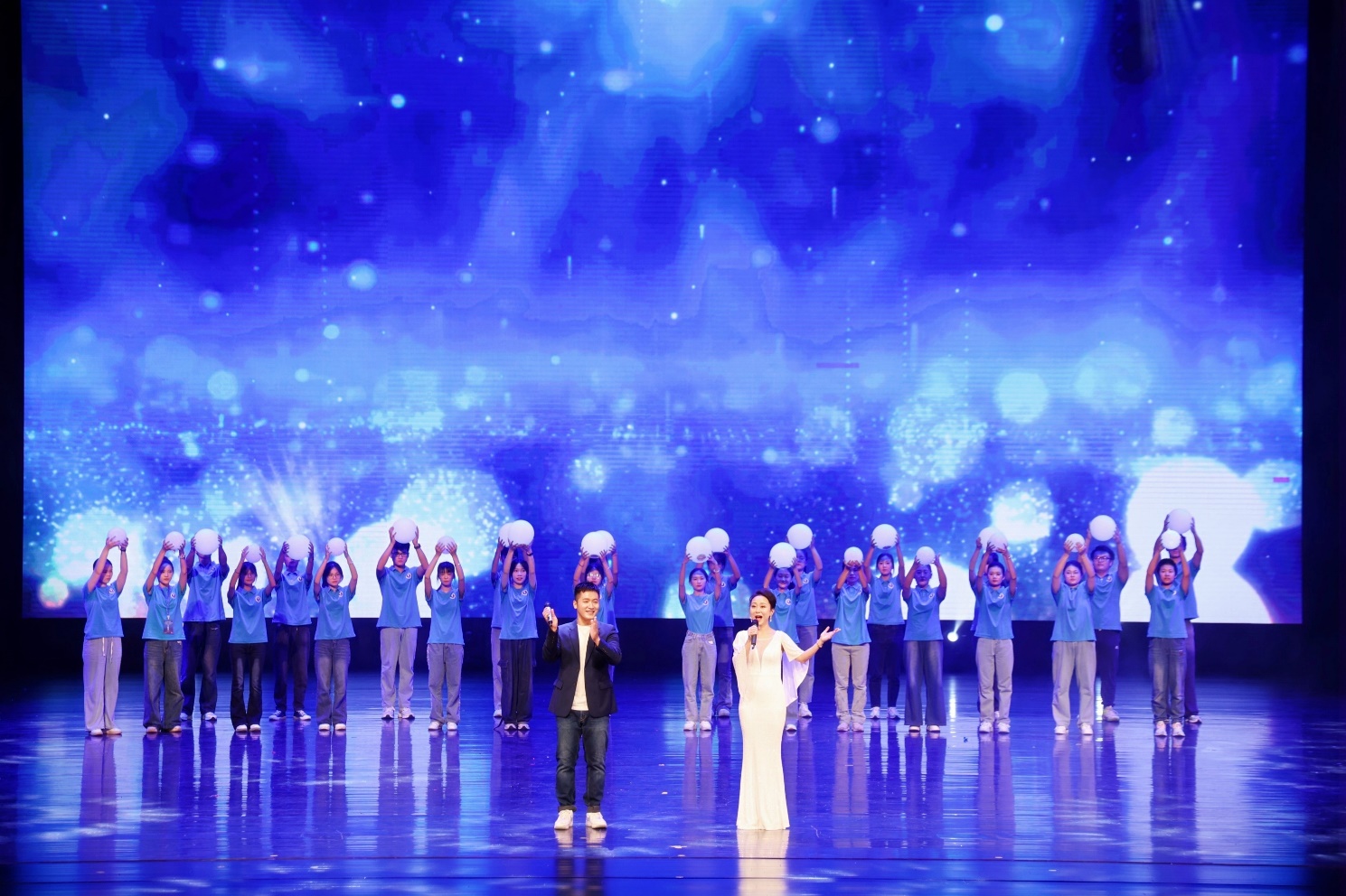 歌伴舞《光》由艺术公司青年教师田昀艳副教授、suncitygroup太阳新城青年教师周剑带领两院的同学们共同演绎。节目展示了学习海洋知识如同一场追逐光明的旅程,学子们在知识的海洋中勇敢探索、不断前行,追逐那一束束照亮未来的希望之光。