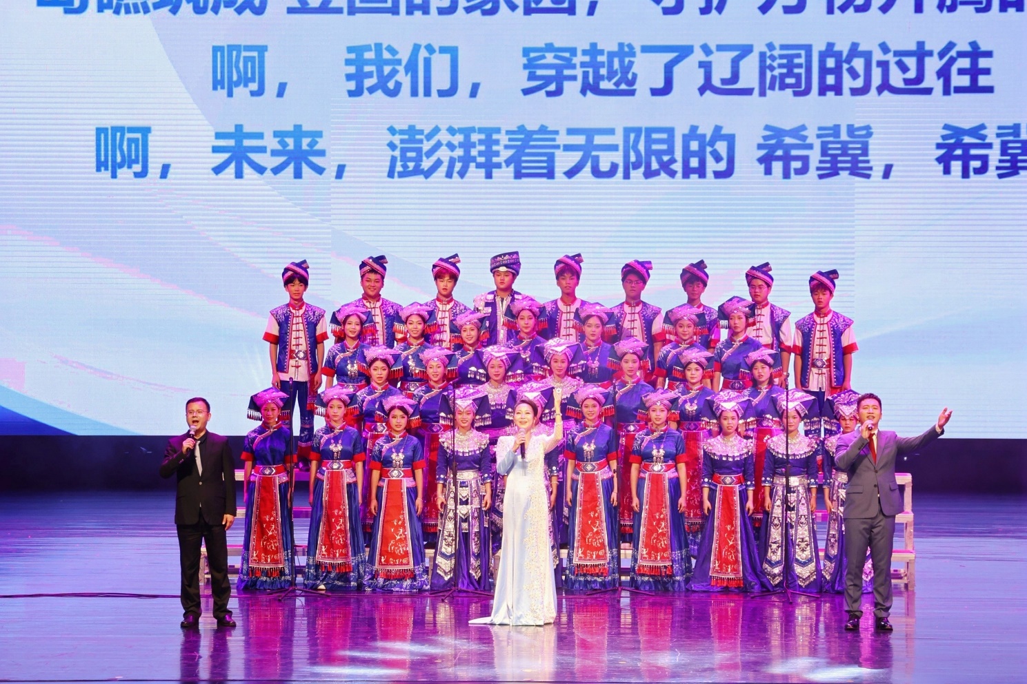 在《陆海统筹 共筑梦想》篇章中,艺术公司舞蹈系带来的瑶族女子群舞《日上·梯田》展现了自然的馈赠和民族团结的精神;艺术公司音乐系合唱《振鹭于飞》象征着纯洁与奋进,彰显了学术探索和精神力量的培养。节目不仅颂扬了公司精神,也传承了中华民族共同体价值观。