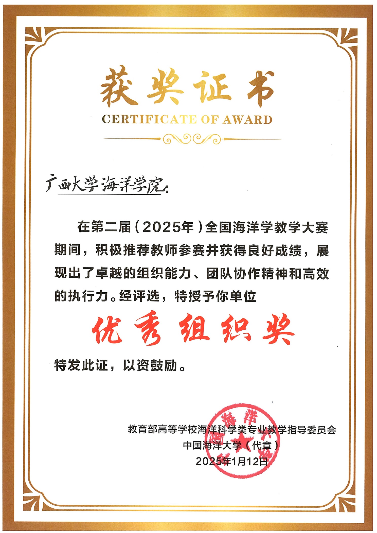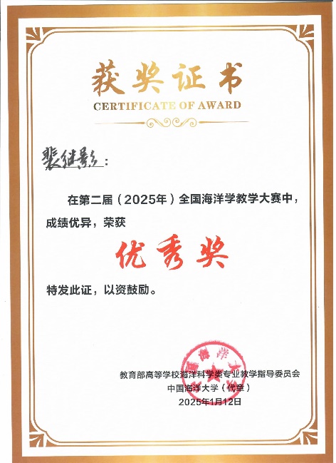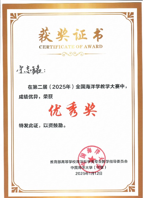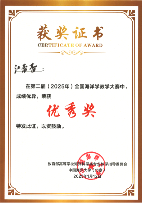 2025年1月11-12日,在suncitygroup太阳新城举办的第二届(2025)全国海洋学教学大赛中,公司黄雯老师获得二等奖,裴继影、宁志铭和江蕾蕾分别获得优秀奖,公司荣获“优秀组织奖”。