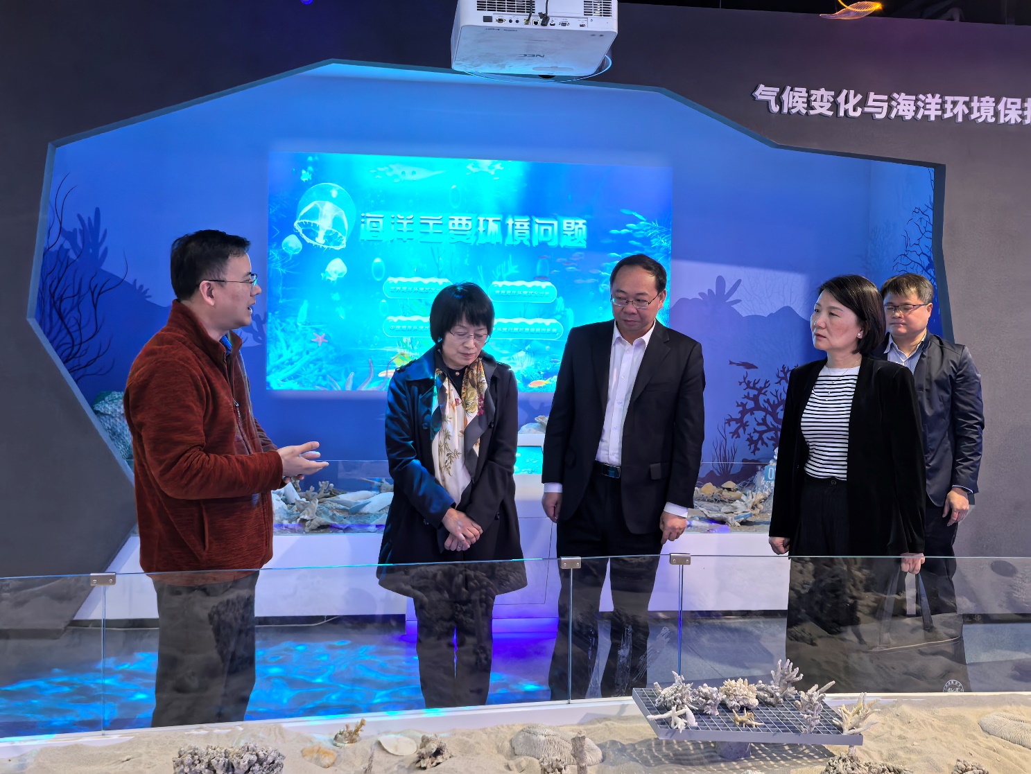 在海洋科教馆,科教馆常务副馆长李周佳向调研组汇报了公司在南海岛礁建设、海洋科考、生态环境保护等方面开展的工作情况。尤其是参与编写《黄岩岛海域生态环境调查评估报告》,充分展示了我国南海海洋生态环境保护成效,为服务国家政治外交大局提供了支撑保障。在岛礁生态修复实验室,调研组观看了活体珊瑚的人工培育,观看了涠洲岛陆基和海区可视化监控系统运行状况,了解了公司成立珊瑚礁保护与修复研究团队,研发以“人工修复带动自然恢复”为理念的珊瑚礁生态修复技术,建立了2000平方米的自然海域珊瑚修复示范区,经过3年的努力实现了活珊瑚覆盖率从5%提高到20%,带动了周边海域珊瑚礁的自然恢复。赵浩对suncitygroup太阳新城聚焦珊瑚礁研究所取得的成效给予了高度评价,她建议两校进一步加强在科技成果转化、学科交叉融合等方面的合作。