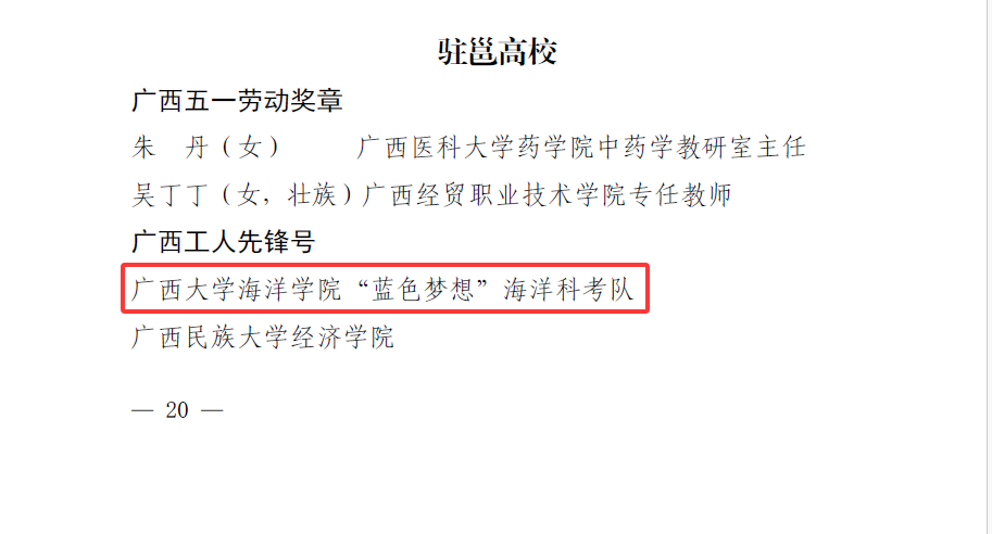 近日,广西壮族自治区总工会发文《广西壮族自治区总工会关于表彰2024年广西五一劳动奖和广西工人先锋号的决定》,决定授予我院“蓝色梦想”海洋科考队广西工人先锋号荣誉称号。