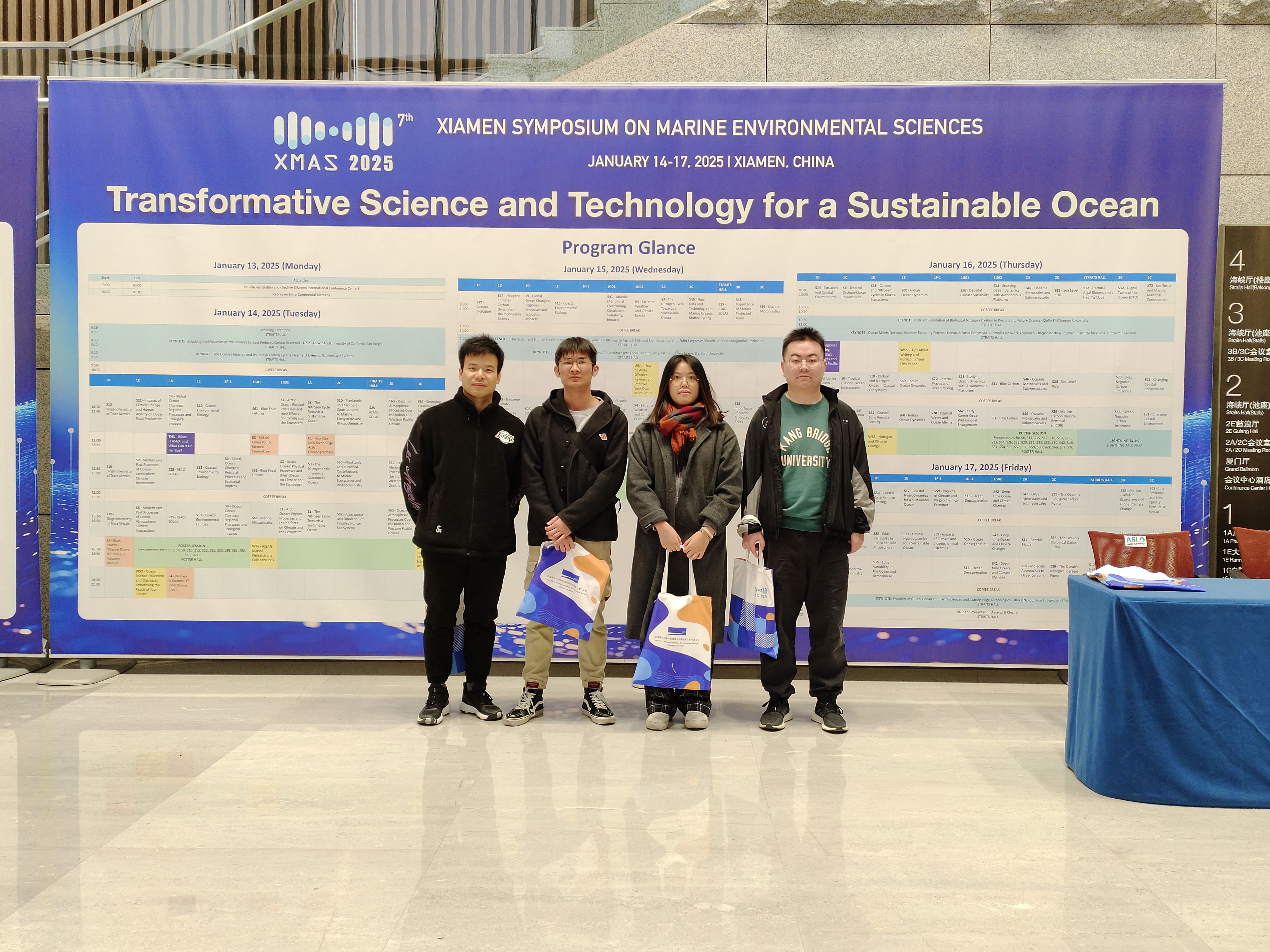 公司陈小燕副教授课题组彭润乾、吴秋昀、闫兆千和刘珂等4名研究生获得“suncitygroup太阳新城研究生倍增计划-研究生素质能力提升项目”资助,于2025年1月14日至17日,前往中国福建省厦门市参加了第七届厦门海洋环境科学研讨会(The 7th Xiamen Symposium on Marine Environmental Sciences)。在海洋表层与低层大气中的化学和物理学分会场(Chemistry and physics at surface ocean and lower atmosphere)作了题为“Wildfire Particulates Enhance Phytoplankton Growth and Alter Communities in the South China Sea Under Wind-Driven Upwelling”和“Coral Nutritional Strategies in Response to Wildfire Ash Deposition”展板报告。