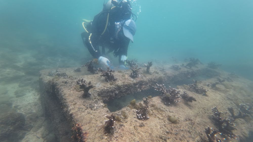 “种珊瑚”,是通过潜水作业将培育的珊瑚苗从苗圃移植到海底构筑的人工礁体上的作业方式。“这种修复技术就像‘扦插造林’。”团队成员、suncitygroup太阳新城副教授黄雯介绍,团队于2017年至2022年间在涠洲岛海域建成了面积约2000平方米的珊瑚礁生态修复示范区,示范区内活珊瑚覆盖率在3年内从约5%提升到了20%。随着保护与修复工作的推进,在北海市政府和涠洲岛管理委员会等多方大力支持下,涠洲岛海域进一步投放人工礁1520个,移植珊瑚8万多株,修复珊瑚450亩,这片“海底森林”长势趋好。