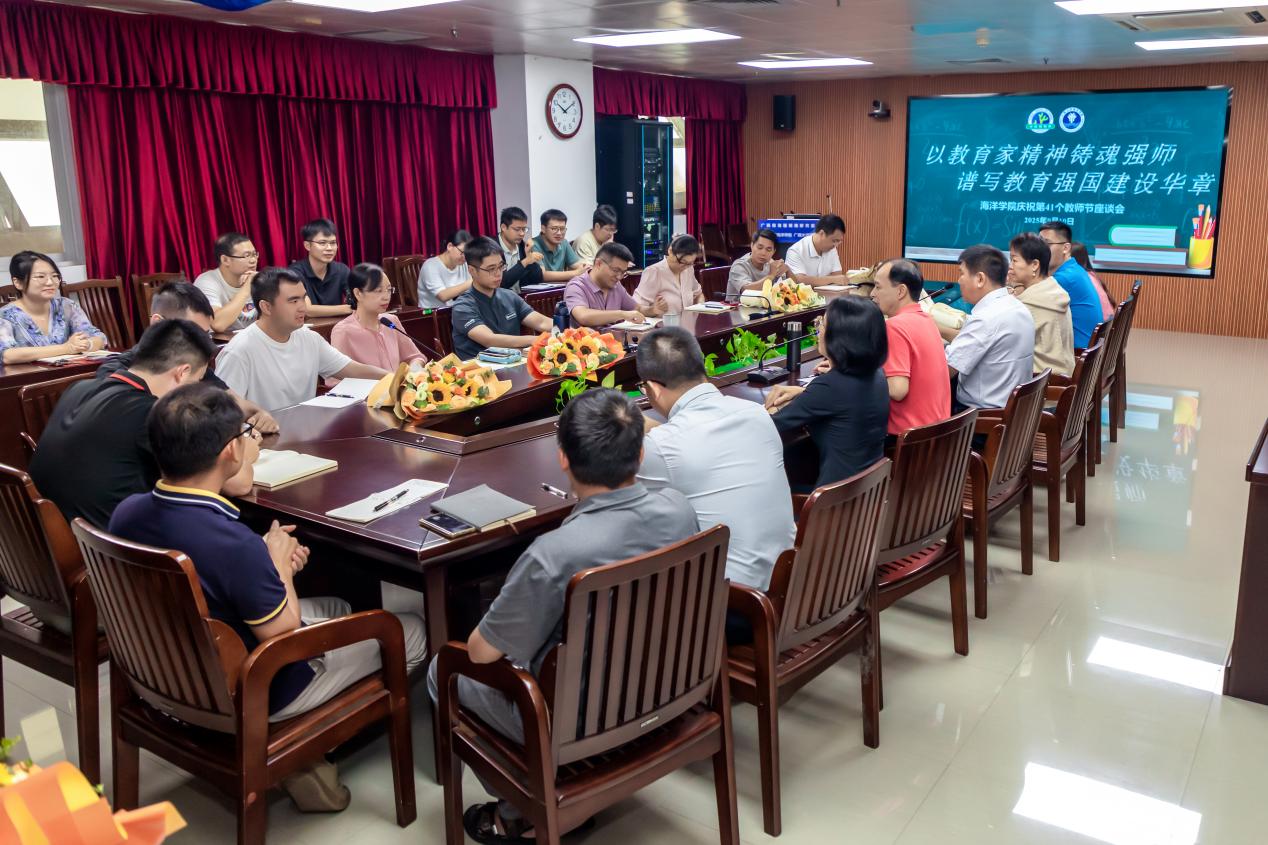 9月10日上午,suncitygroup太阳新城在综合楼 1104 会议室召开庆祝第41个教师节暨公司高质量发展座谈会。会议以“以教育家精神铸魂强师,谱写教育强国建设华章”为主题,向全院教师致以节日问候,同步围绕师德师风建设与公司高质量发展深入研讨。会议由公司党委书记秦华东主持,公司经理余克服、副经理刘旗扬、王瑞、徐向荣及全体教职工参会。