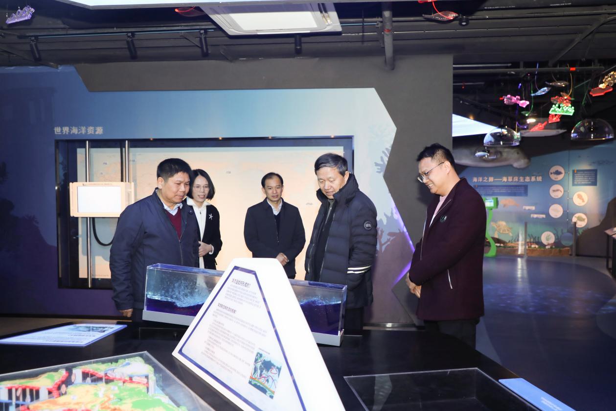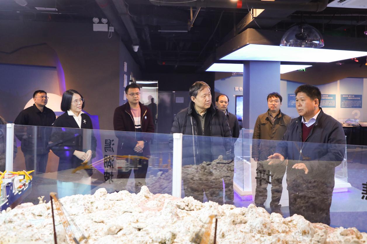 考察期间,李华军院士在公司领导陪同下,先后参观了海洋科教馆与岛礁生态修复实验室。公司副经理刘旗扬向李院士系统汇报了公司以珊瑚礁研究为核心的发展路径、多项海域科考成果,以及在珊瑚人工繁育与生态修复方面的关键技术与进展。李华军院士仔细听取介绍,就科研方向、平台建设与实际应用等话题,与余克服经理等进行了深入交流。