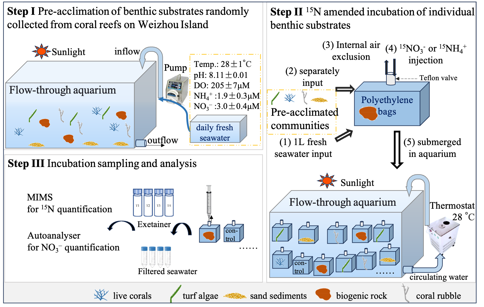 研究采用15N同位素示踪技术,对涠洲岛珊瑚礁区的五种典型底质类型(活珊瑚、草皮藻、沉积物、生物礁石和死珊瑚碎块)的反硝化、硝酸盐异化还原为铵(DNRA)和厌氧氨氧化速率进行了系统分析,获得了以下创新性认识:(1)多种底质类型均存在DNRA过程,在活珊瑚、草皮藻、沉积物、生物礁石和珊瑚碎块等不同底质类型中均检测到DNRA活性,拓展了当前对珊瑚礁系统氮循环的认知。(2)不同底质类型反硝化与DNRA速率差异显著,各类底质间反硝化和DNRA速率差异可达数倍,这种差异与底质生理形态(如块状珊瑚组织更厚)、有机碳与氮含量比值(C:N)及共生藻密度等因素密切相关。(3)富氮珊瑚礁氮移除潜力高,但存在“饱和效应”,与贫氮珊瑚礁区相比,涠洲岛等富氮区域的氮移除及DNRA潜力高出1–2个数量级,然而,当硝酸盐浓度从10 μM升高至20 μM时,相关速率并未显著增加,表明在富氮环境中珊瑚礁氮循环过程趋于饱和。(4)生态管理建议:控氮优先,保护高活性底质,基于上述发现,建议在珊瑚礁保护管理中应严格控制近岸人为氮排放,并优先保护具有高反硝化潜力的底质类型(如块状珊瑚和生物礁石),从而提升珊瑚礁生态系统对富营养化胁迫的自我调节与恢复能力,为珊瑚礁可持续保护提供科学策略。