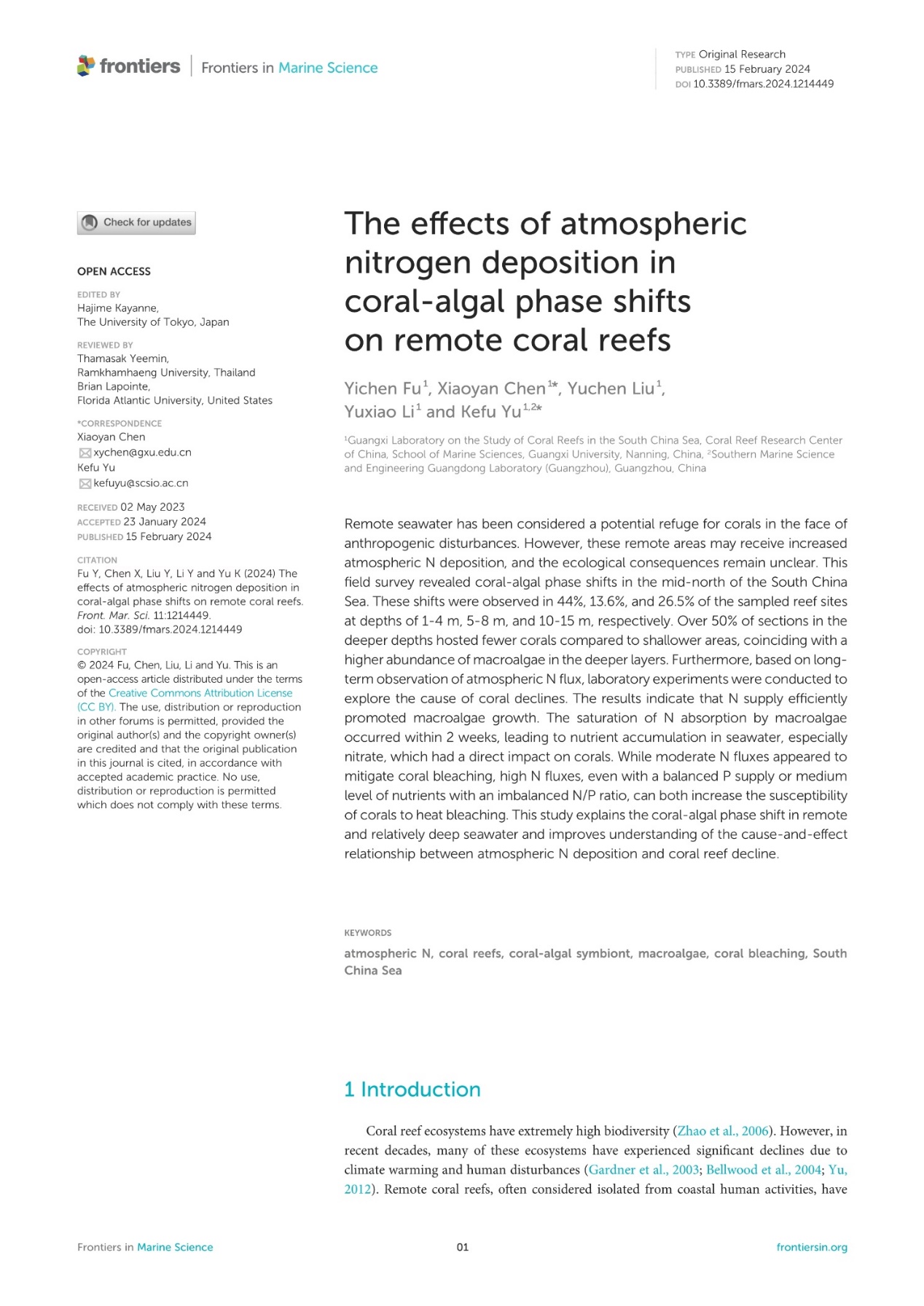 Recently, master's student, Yichen Fu, published a research paper entitled "The effects of atmospheric nitrogen deposition in coral-algal phase shifts on remote coral reefs" in Frontiers in Marine Science (JCR Q1) as the first author under the supervision of associate professor Xiaoyan Chen.